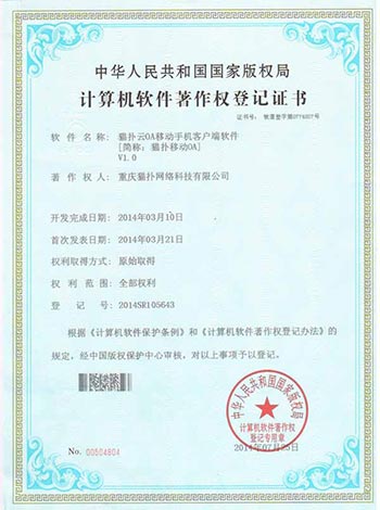 《MaopOA猫扑协同办公自动化系统》 是重庆猫扑网络科技公司历经数年时间独立创作开发而成,且在不断的进行升级开发。猫扑智OA的源代码、布局、界面设计、电子文档等均已提交国家版权局登记备案,并已获得著作权审批 和销售许可 (软著登记字第 0384628 号 登记号 2012SR016592)。