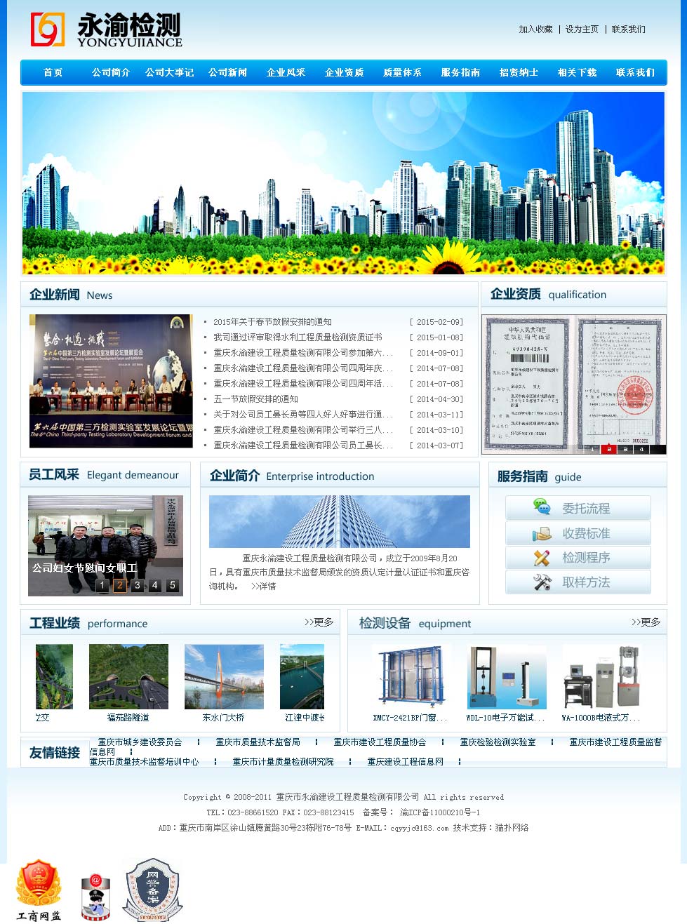 重庆永渝建筑工程质量检测有限公司是一家具有独立法人地位的社会第三方专业检测机构,具有重庆市质量技术监督局颁发的资质认定证书和重庆市城乡建设委员会颁发的质量检测资质证书。为重庆市资质等级较高、业务范围较广、规模较大的专业检测机构。