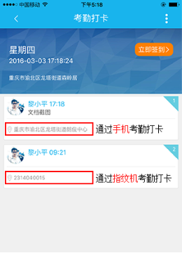 ( 4 )签到完成后,在考勤打卡主界面会出现当天的打卡记录流水,方便用户自己查看自己考勤情况,包含打卡时间,地位位置。