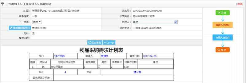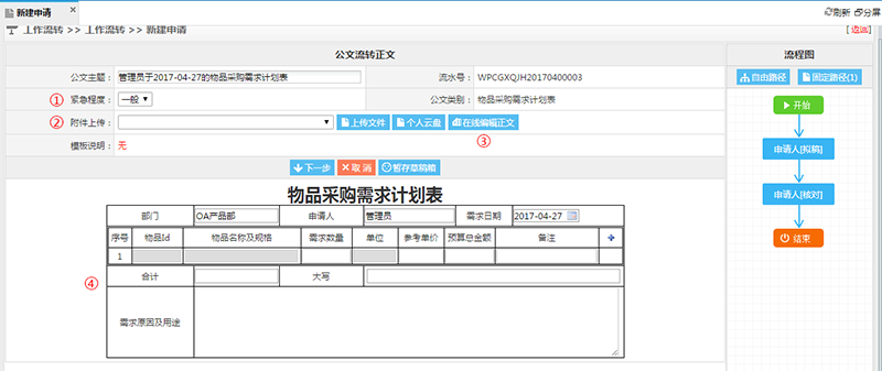 ④ 表格填写时,如部门、申请人、时间等栏目由系统读取当前用户资料自动生成,灰色栏目可以选择设置选项。