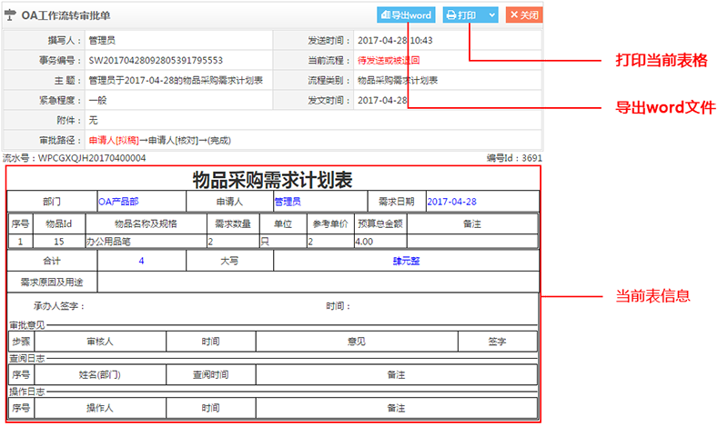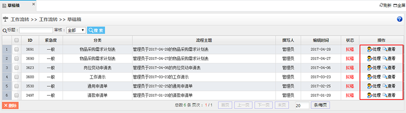 在新建申请中暂存草稿箱的表在这里罗列出来,可以对其进行操作。处理操作会回到流程中继续流程;查看操作会显示当前表的信息,并且可以导出word和打印。