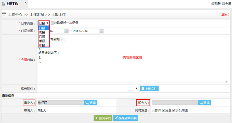 日志类型可分为日报、周报、月报、季报、年报,下一步编写好后上报工作内容后,选择审批人员、知会人员,最后提交审批或者暂存至草稿箱。