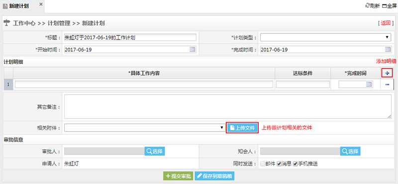 提交审批的计划,系统会自动把报告信息同步到“我的计划”、审批人的“计划审批”、知会人的“知会我的”功能模块里。(与工作汇报相同)