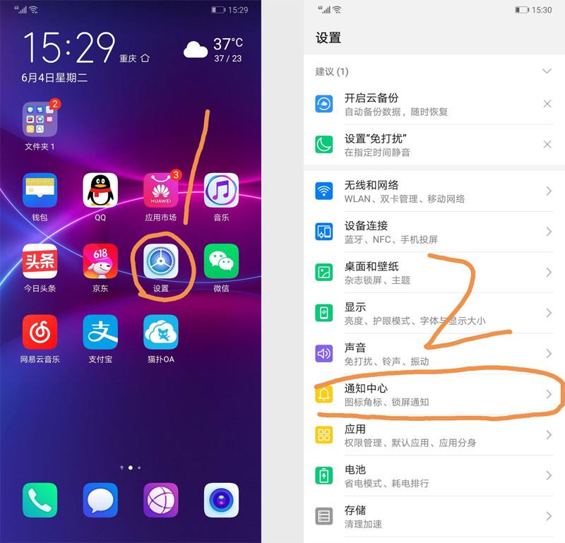 ( 1 ) 在手机桌面点设置,找到通知中心