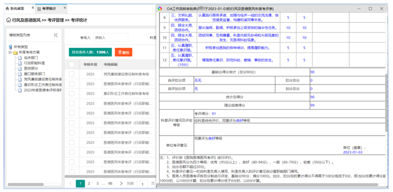 通过OA系统,采集相关考评数据,包括考评模板、考评科室、考评人、考评得分、考评等级统计等,为考评提供客观依据。可以按年份、科室、个人、考评方案等条件进行统计医德考评,考核结果并可以导出。