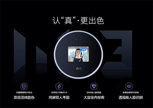 认“真”·更出色,无惧视频照片攻击、双目活体防伪、支持双人同时打卡、同屏双人考勤、3000张人脸容量、各类妆容皆可识别
