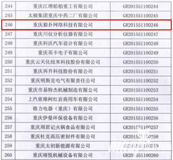经全国高新技术企业认定管理工作领导小组办公室备案审查,同意认定重庆猫扑网络科技有限公司等331家企业为高新技术企业(名单附后),有效期从2015年11月10日至2018年11月9日。