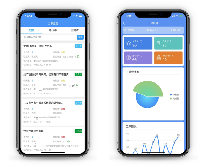 2、通过电脑端、App实时创建派发工单、工单池自主抢单;针对不同优先级,响应或是解决售后问题,保障服务质量。