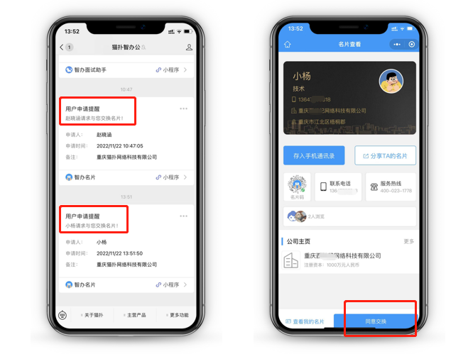 业务人员名片可随时分享给客户、朋友查看;名片交换发起申请则通过微信公众号来提醒,交换通过迅速入库至名片夹中,自动获取客户联系方式,便捷引流。