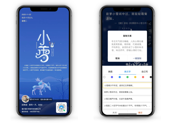 增加“每日海报”功能,支持用户自定义修改海报内容、文案复制,一键生成海报图片;通过分享至朋友圈吸引用户眼球,在短时间内用低成本获取高曝光的机会,触及整个人脉圈。