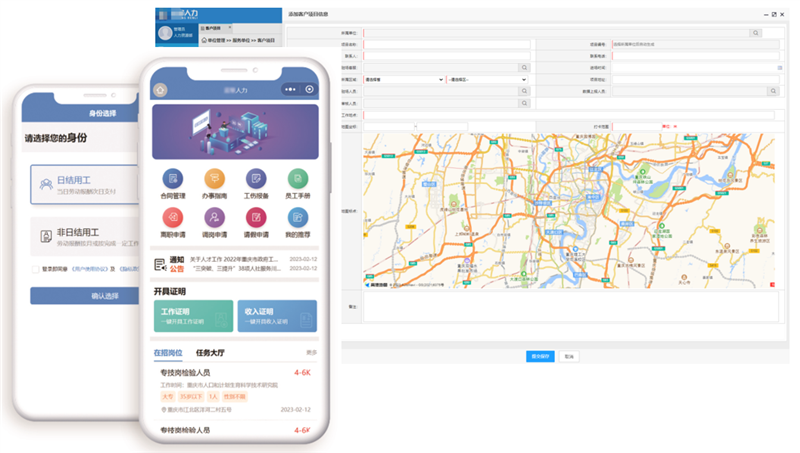 驻场人员:维护系统平台的员工入离职管理;添加维护客户项目信息,管理项目经理人员信息;确认灵活职业者的考勤打卡购买对应的商业保险;