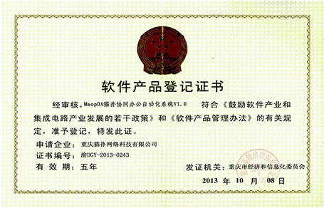 《MaopOA猫扑协同办公自动化系统》 是重庆猫扑网络科技公司历经数年时间独立创作开发而成,且在不断的进行升级开发。猫扑智OA的源代码、布局、界面设计、电子文档等均已提交国家版权局登记备案,并已获得著作权审批 和销售许可 (软著登记字第 0384628 号 登记号 2012SR016592)。