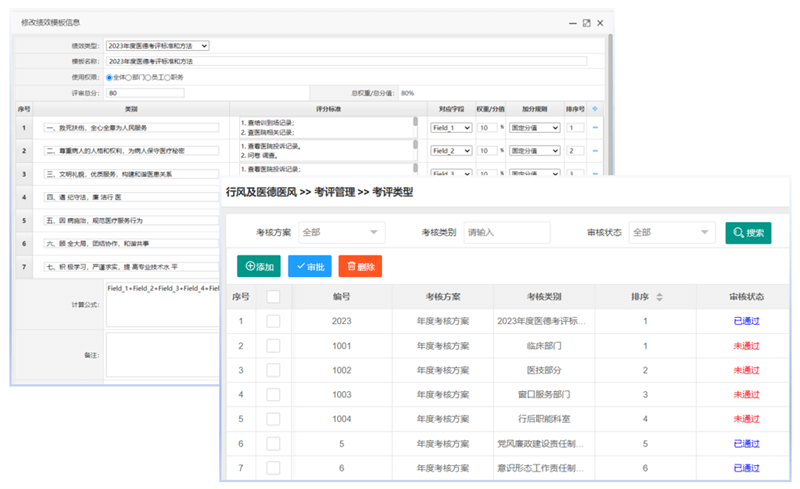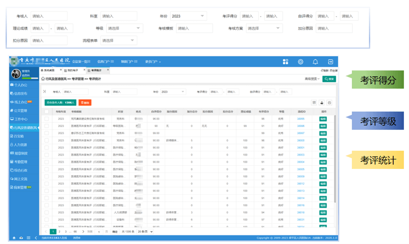 通过OA系统,采集相关考评数据,包括考评模板、考评科室、考评人、考评得分、考评等级统计等,为考评提供客观依据。可以按年份、科室、个人、考评方案等条件进行统计医德考评,考核结果并可以导出。