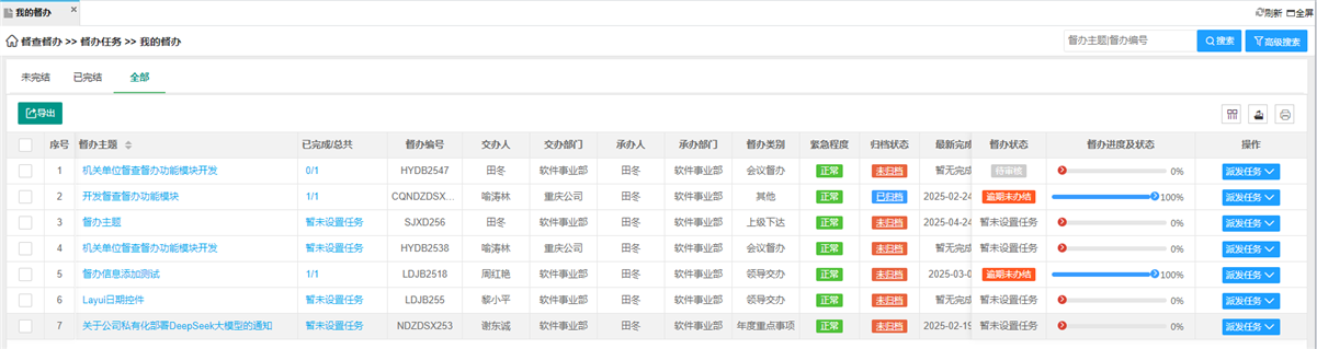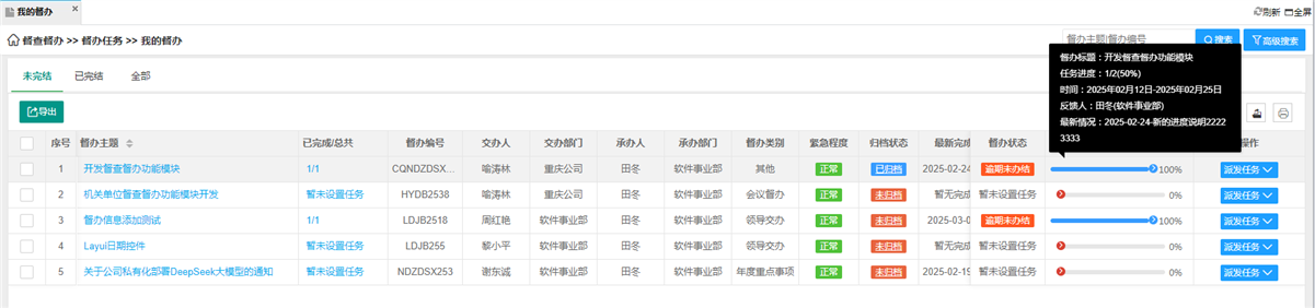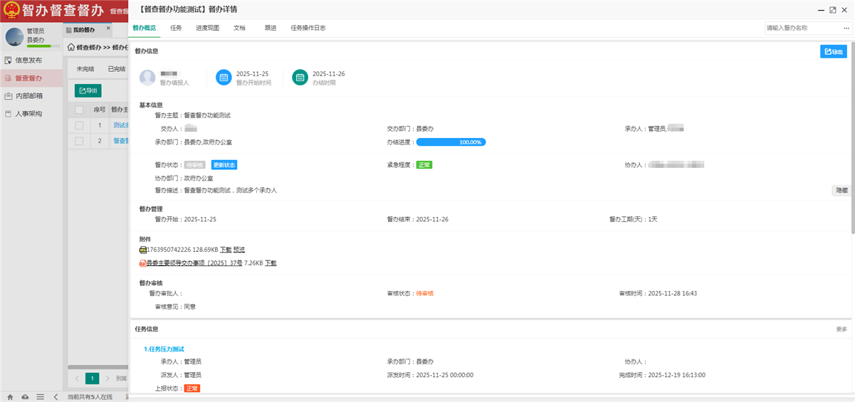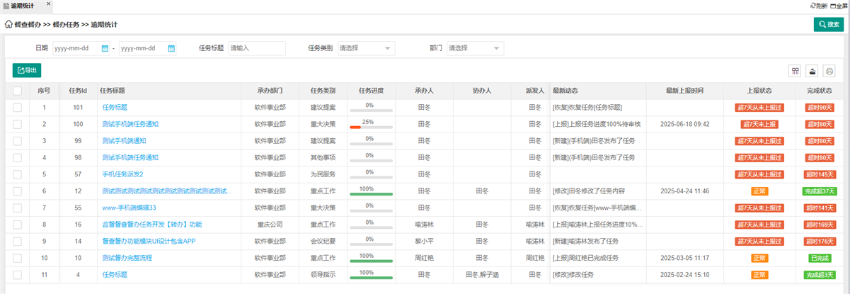 · 任务完成后,执行人提交成果(如报告、数据、证明文件),督办负责人审核确认是否达标。