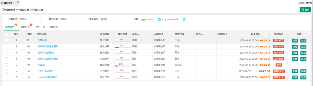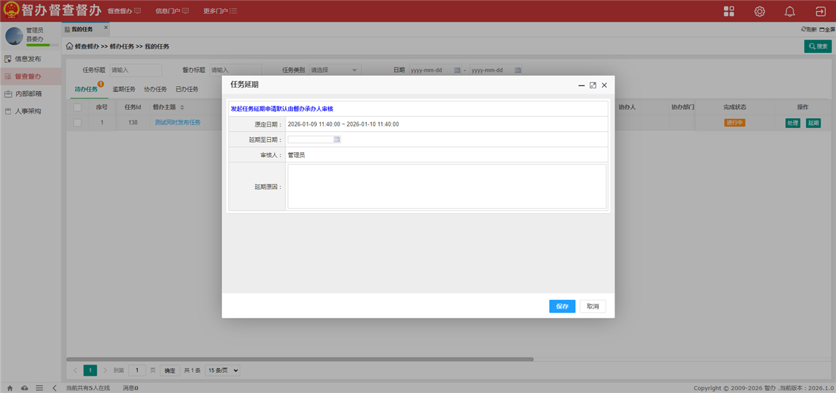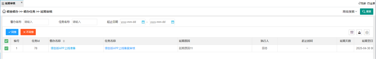 · 用户提交任务延期申请后,督办负责人可审核理由是否合理,批准或驳回并反馈意见。