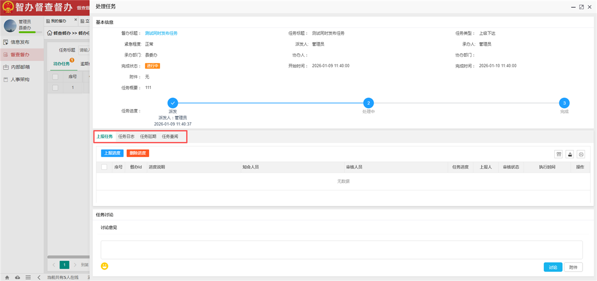 · 普通用户查看被分配的具体任务,支持任务反馈(文字、附件)、进度填报及申请延期。