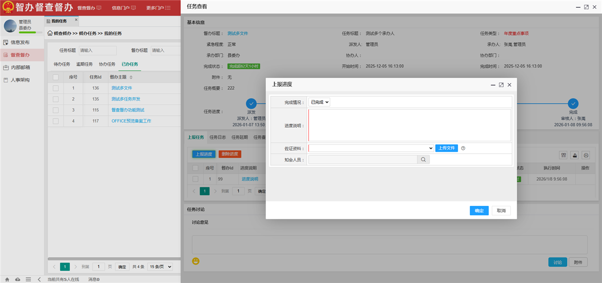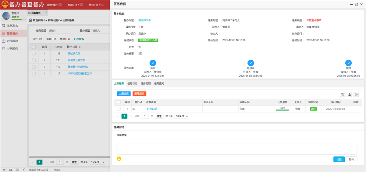 进度管理的核心在于“管过程、抓落实、促实效”,通过常态化跟踪催办,全程把控督办事项推进节奏,及时解决推进中的堵点难点问题,确保事项按时保质完成。建立便捷高效的跟踪机制,督查人员可随时追踪督办工作的完成进度,同步查看领导点评意见、相关批示要求,精准把握办理方向,确保督办工作不偏离重点、不出现偏差。
