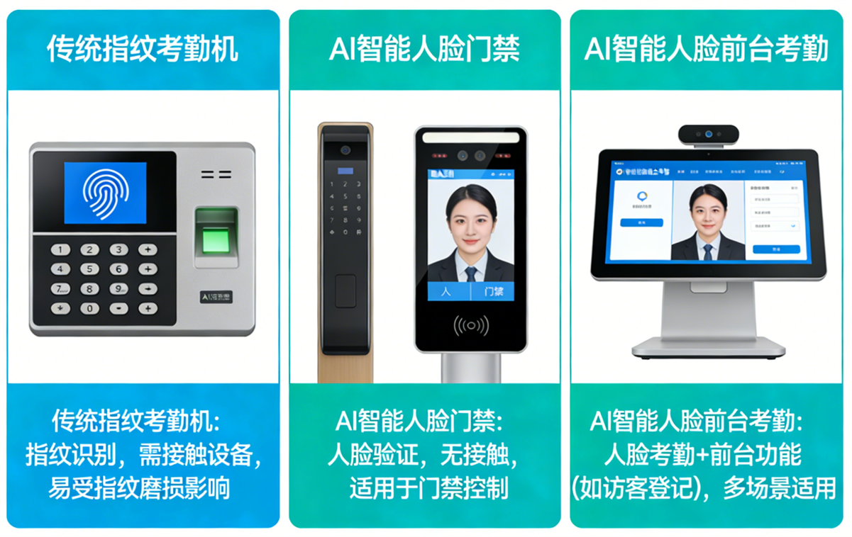 传统指纹考勤机与AI智能人脸门禁、AI智能人脸前台考勤的核心区别