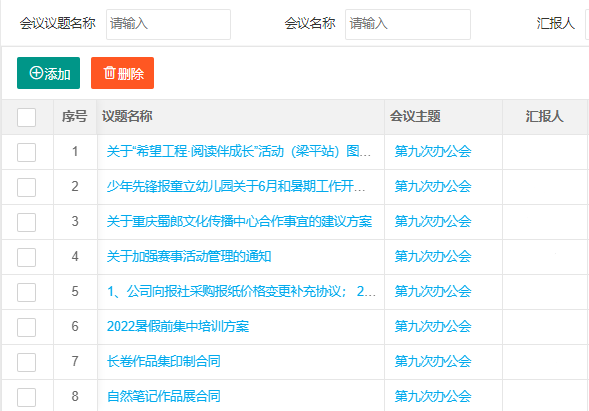 将会议管理、参加会议等会议相关环节通过信息化方式实现,参会人员在系统上签到,可以直接通过pc端、手机端查看会议资料内容,会议议题,参加会议。实现对在办、历史会议的按会议室、议题等流程记录,帮助企业形成详细的会议情况,提高管理层审批、监督效率。通过OA快速发起会议议题收集审批流程,议题申请核心内容为议题名称及议题描述。